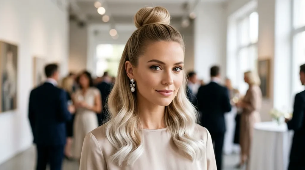| 13 | Half-Up Bun with Soft Retro Waves | Top knot + vintage waves | Fancy brunches, rooftop events | Medium–long |