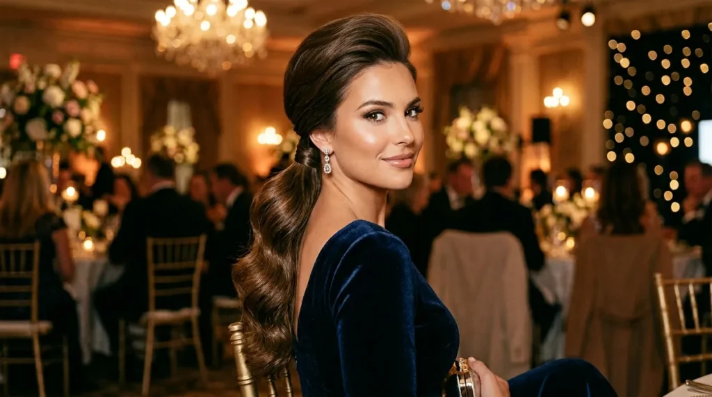 Hold tip: An extra shine spray and a small edge brush for the baby hair keep the snatched look polished rather than severe. A quality elastic and concealed pins hold the pony up reliably through dancing. Pair with a fitted dress or cropped blazer and heels. This style says you came to the event, and your hair got the message first.