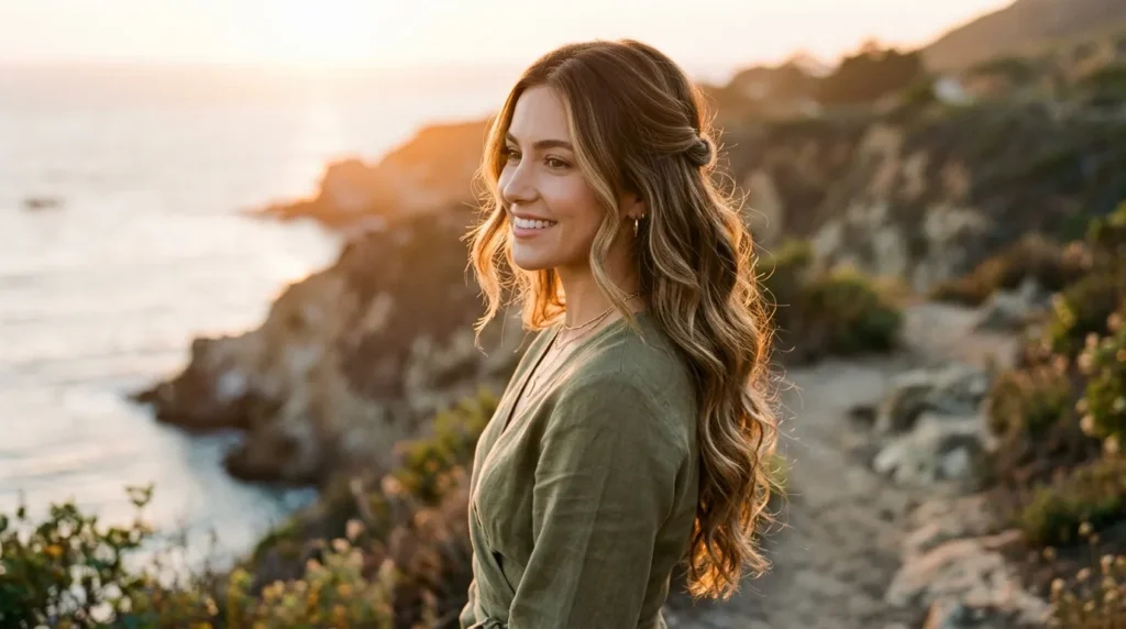 This style is built on warmth. Chestnut roots melting into caramel balayage, the top gently twisted back on each side into a subtle half-up hold, and the waves below producing that golden-hour effect where every strand seems to glow. The movement is comfortable and breathable but the overall shape is purposeful — this is the kind of half-up style that appears constructed even though it looks effortless.