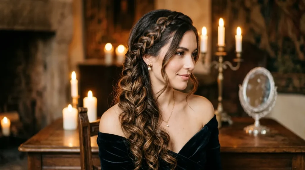 This is fairytale energy with adult elegance. One side braid gently twisted across the front and lost in a cascade of waves, adding just enough structure to the top without imposing rigidity on the texture. The dark brunette base with honey accent highlights creates a wave that catches candlelight beautifully — it’s as though the color was specifically placed to work in low, warm light. Romantic but not saccharine.