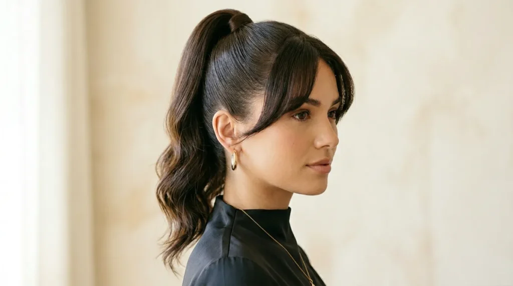 | 4 | Sleek Pony with Butterfly Bangs | Sleek half pony + curtain bangs | Everyday, formal, warm weather | Straight–wavy |