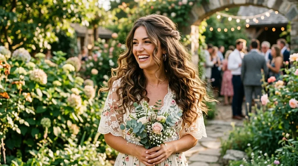 According to Make Me Bridal’s 2026 bridal guide, boho braided styles continue to “reign supreme” because they “seamlessly blend timeless beauty with a modern, trendy flair.” This version specifically earns its place in the half up half down hairstyles 2026 wedding category because it works for garden weddings, spring festivals, backyard brunches, and any outdoor occasion without requiring any adjustments.