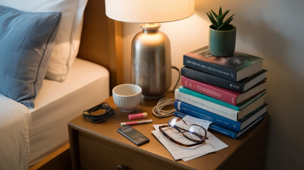 Nightstands are magnets for clutter: multiple books, tangled chargers, jewelry, hair ties, hand creams, receipts, and cups all pile up quietly. By the time you notice, your bedside table feels like a mini thrift shop. This home clutter habit is especially draining because it’s the last thing you see at night and the first thing you see in the morning. Paring it down to a lamp, one book, water, and a small dish for tiny items makes your bedroom feel calmer instantly.