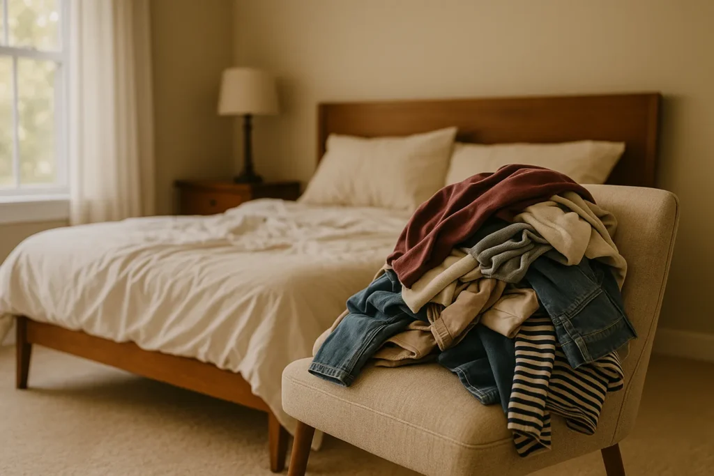 You know that chair — the one that started out cute and functional, and slowly turned into a second wardrobe. At first, it’s “just for a minute,” then suddenly it’s layered with jeans, sweaters, and half-worn outfits you’re “not done with yet.” This home clutter habit makes the whole bedroom feel crowded and unfinished, even when the floor is vacuumed. Swapping the chair pile for a simple system (like one hook for re-wear items and a hamper for the rest) instantly clears mental and visual space.