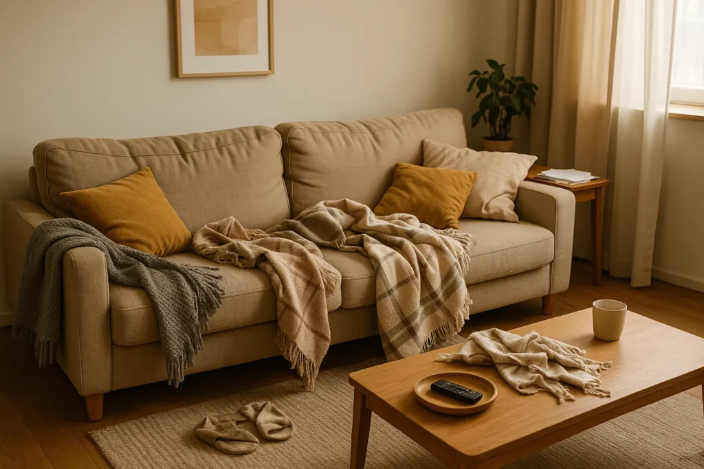 Real-life living room showing everyday home clutter habits like shoes, cups and blankets making the space look messy.