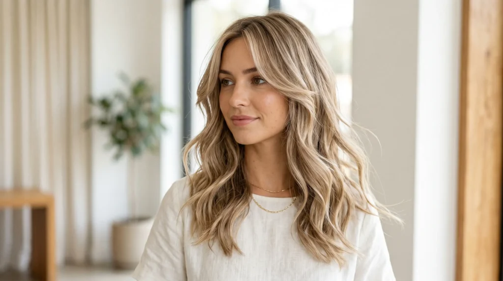 This is the quiet luxury version of the honey blonde trend 2026. The highlights are blended smoothly through the mid-lengths in a creamy honey beige that sits between warm and cool. The loose waves are weightless, and the face-framing strands fall in soft, flattering lines.