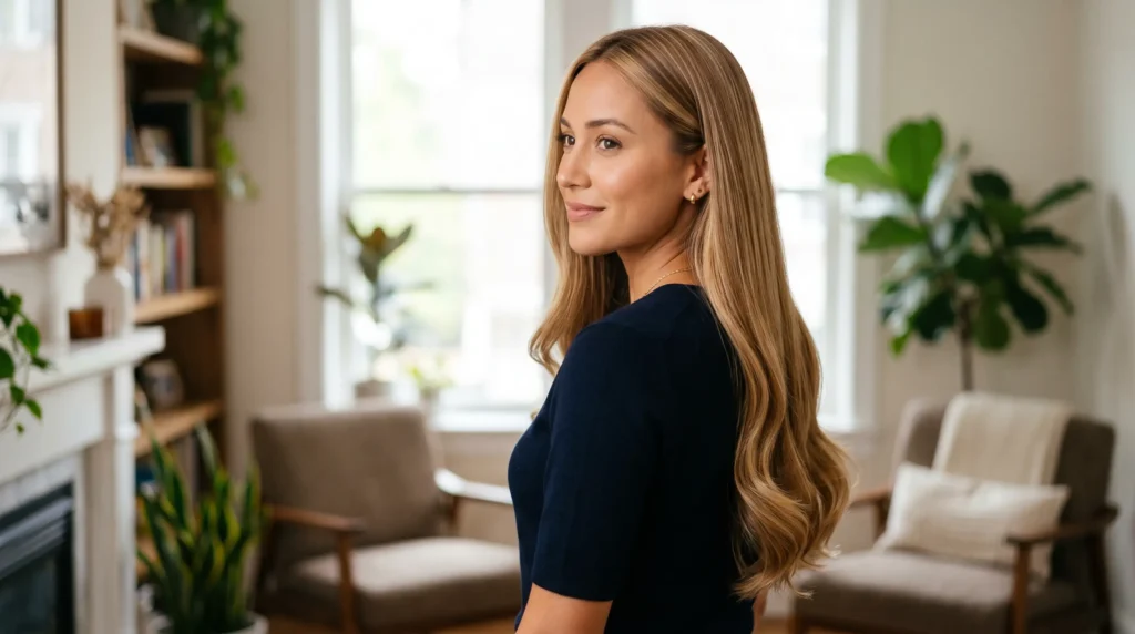 Now here’s where it gets interesting: people assume this shade requires constant upkeep. It doesn’t. The face-framing placement does the heavy lifting, and as long as you’re using a heat protectant that maintains the honey tone while you style, the color holds beautifully between appointments.