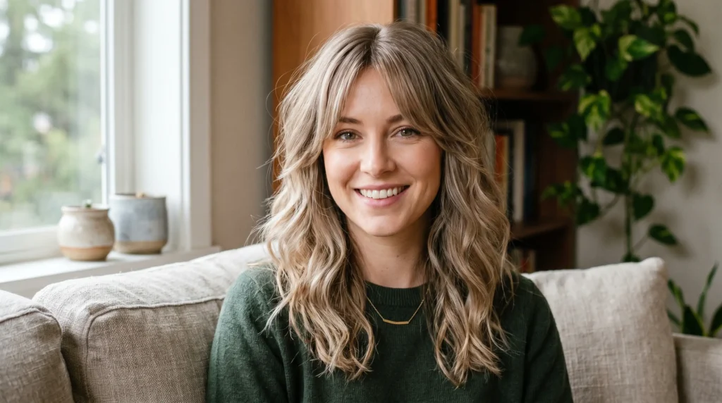 The curtain-like front pieces give a looser frame around the face, and the way they fall in casual, light folds is less “I just got highlights” and more “I’ve just always looked like this.”