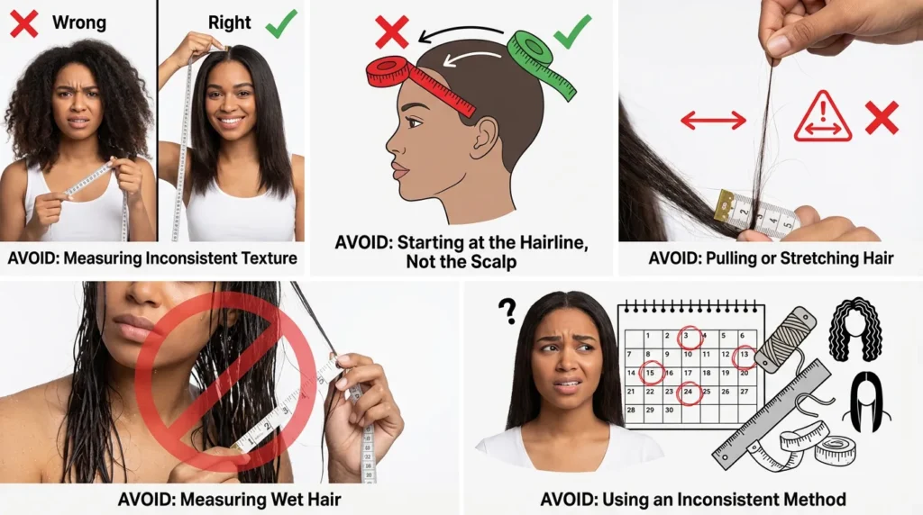 The key takeaways? Use a soft measuring tape, start from your scalp (not your hairline), keep your hair straight and dry, and measure from the same spot every time. Do this consistently, and you’ll have reliable measurements you can actually trust.