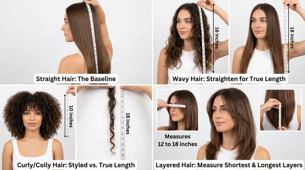 For these hair types, I recommend measuring both stretched length (gently pull a strand straight without heat) and natural length. This gives you the full picture.