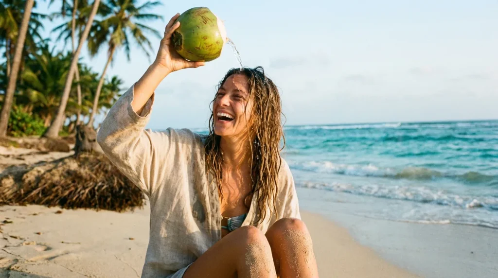 This might sound weird, but hear me out. Coconut water is packed with minerals and electrolytes that can help restore your hair’s natural balance after salt water exposure.