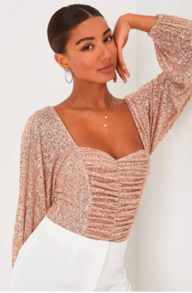 A rosy sequin top is perfect when you want sparkle but still love softer, romantic shades. The blush-toned shimmer is flattering on so many skin tones and gives your face a natural glow, especially under warm indoor lighting.