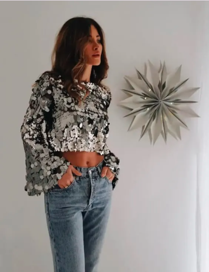 You don’t always need a full glam outfit to wear sequins. A cropped sequin top with classic high-waisted jeans is the perfect blend of casual and festive. The jeans relax the look, while the sequins instantly make it party-ready.