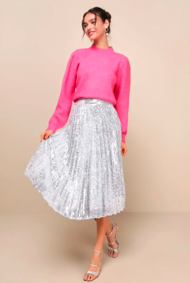 This look proves that cozy and glam can exist in the same outfit. A soft knit sweater (especially in pink, cream, or pastels) tucked into a sequin skirt creates the sweetest mix of textures. The sweater keeps you warm and softens the shine, while the skirt brings the drama.