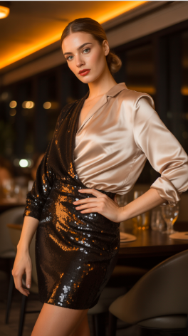 A black sequin skirt with a thigh slit instantly feels evening-ready, especially when paired with an ivory or champagne satin top. The shiny textures play off each other in a really luxe way — one sparkles, the other glows.