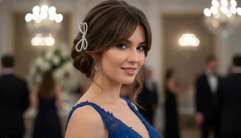 For dressier occasions, this updo pulls layered hair back while leaving curtain bangs out to softly frame the face. Adding a statement accessory like a crystal-embellished bow elevates everything for parties or events. It’s the perfect way to show off both your layers and bangs while looking glamorous and put-together.