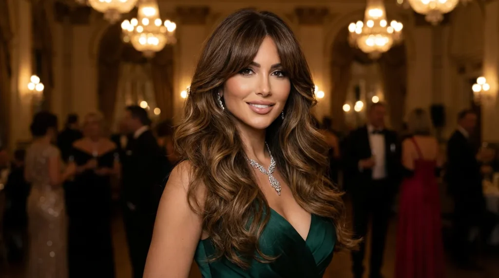 For serious romantic vibes, this long layered cut with big, bouncy waves is everything. Curtain bangs blend perfectly into those long layers, creating softness around the face. This look proves that layers and bangs can totally elevate your style for dressier occasions. It’s romantic, feminine, and absolutely gorgeous.