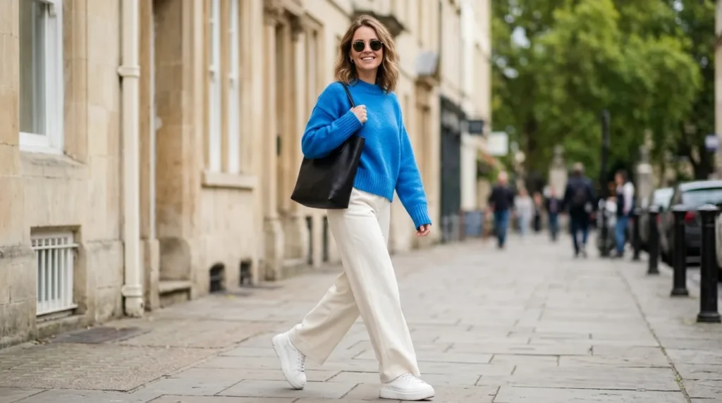 Now here’s where it gets interesting. A bright blue sweater paired with ivory trousers and chunky sneakers isn’t just a cozy casual outfit idea — it’s mood medicine. The contrast between the soft knit and the clean white trouser line is so fresh. It feels seasonless, which means you can wear it basically year-round.