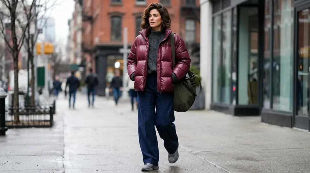 Cold days don’t have to mean sacrificing style. A burgundy puffer jacket layered over a thick gray knit and wide navy pants is one of the best winter lazy day outfits ideas 2026 has going for it. The shimmer of the puffer adds a touch of urban sophistication.