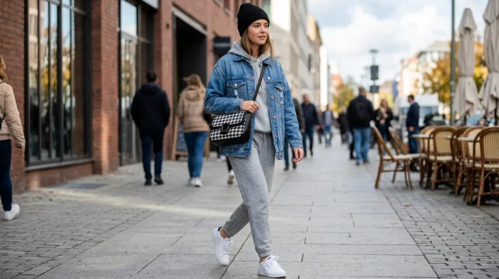 Sometimes all you need to make basics feel intentional is a denim jacket. Soft gray sweatpants with a matching hoodie, an oversized blue denim jacket, and a houndstooth bag is street casual done right. It’s effortless but well-dressed — nonchalantly chic.