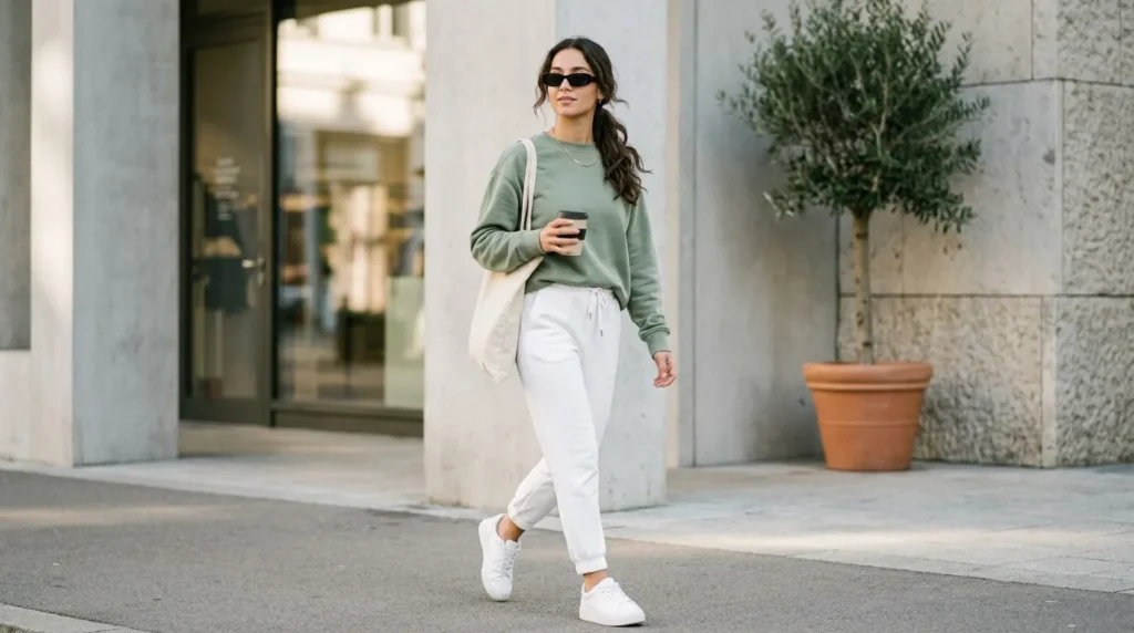 13. Urban Simplicity: Green Crewneck and White Joggers