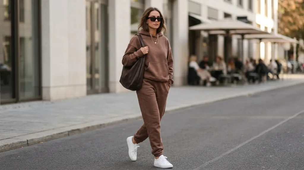 There’s something so satisfying about a head-to-toe neutral set. A cocoa-toned matching hoodie and jogger set is honestly one of the best lazy day outfits ideas 2026 has to offer. It’s a casual aesthetic outfit that looks intentional even when you made zero decisions.