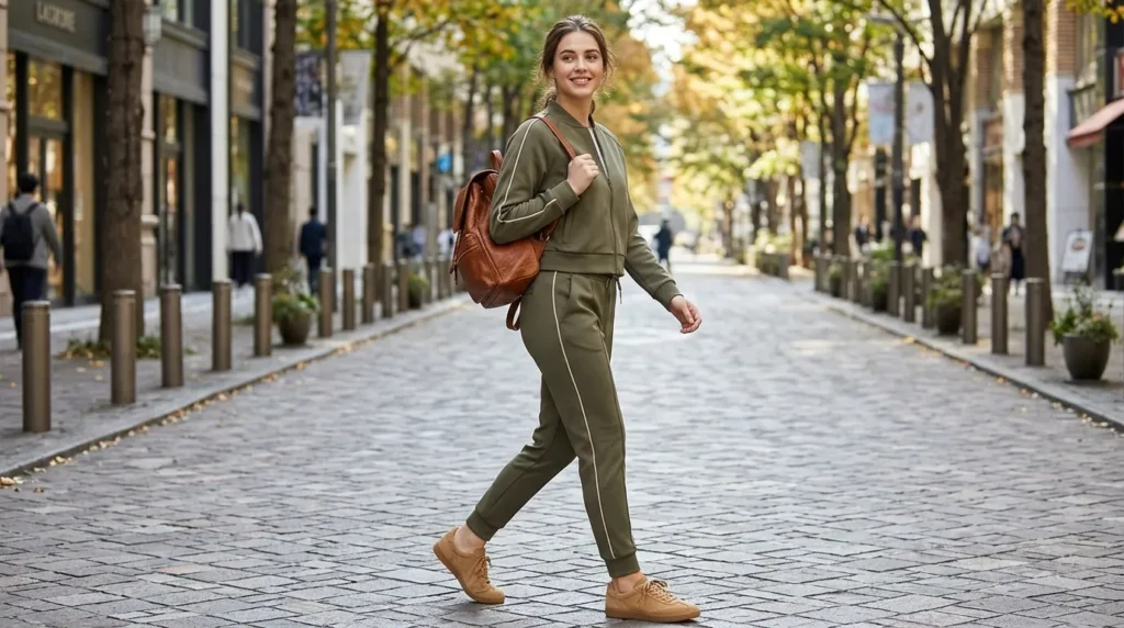 Trends don’t really die — they just evolve. The olive green tracksuit, that early 2000s athleisure staple, is coming back in 2026 but smoother and more refined. Matching striped jacket and joggers with tan sneakers and a brown leather backpack creates a perfectly balanced, earthy look.