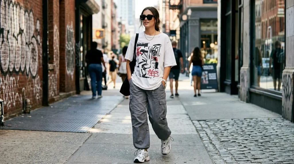 This garment has real urban energy. A loose white graphic tee with gray cargo joggers and chunky sneakers is a streetwear casual aesthetic that’s both functional and fashionable. It’s confident, easygoing, and very 2026.