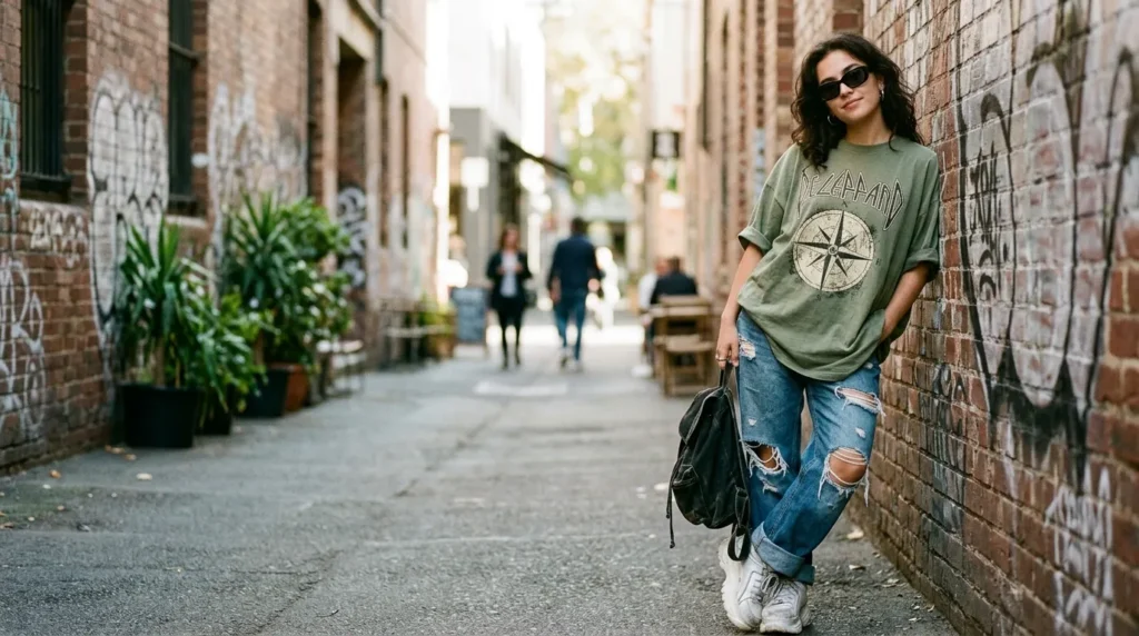 | Oversized Tee + Denim | Graphic tee, ripped jeans | Weekend hangouts |