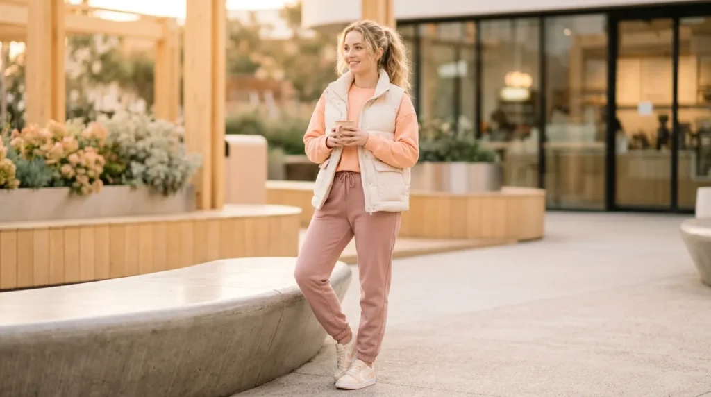 This outfit is warmly optimistic. A peach sweatshirt with a cream puffer vest and toned-down pink joggers — the whole thing is a study in tone-on-tone layering with soft pinks, peaches, and creams living in harmony. It’s a casual aesthetic outfit that makes even the worst mornings feel softer.