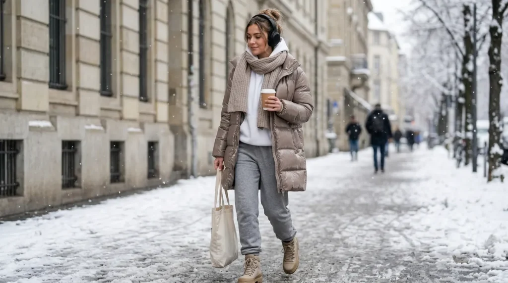 There’s something deeply comforting about wrapping yourself in a glossy taupe puffer coat on a cold day. Pair it with a white hoodie and gray sweatpants, and you’ve got a cozy winter outfit that looks great on a snowy city background. The palette is peaceful — soft neutrals that harmonize beautifully.