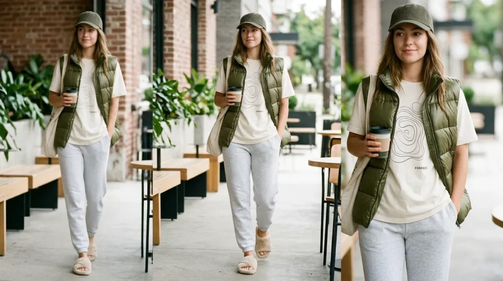 This one is the mood of 2026 in a single outfit. An olive puffer vest over a cream graphic tee with light gray sweatpants is the definition of casual aesthetic. Add fluffy slides and a baseball cap and suddenly loungewear is a whole fashion statement.