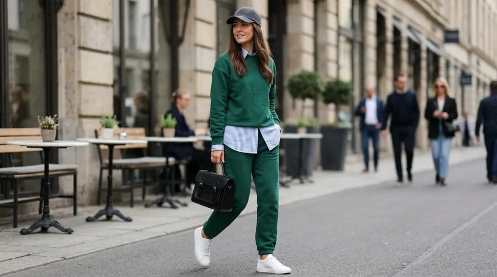 This is what power casual dressing looks like. A deep green sweatshirt and matching joggers layered with a striped button-up shirt and baseball cap. It’s composed, sporty, and relaxed all at once — a casual aesthetic outfit that somehow reads sophisticated.