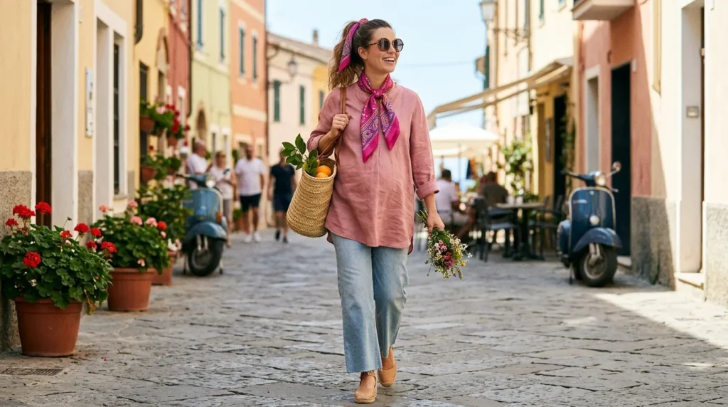 A loose pink tunic, light-wash denim, a fuchsia silk scarf, dark sunglasses, and a woven straw bag. This is pregnancy style that refuses to be boring — and I’m completely here for it.