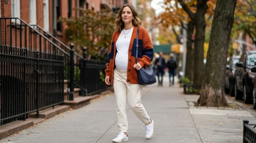 An orange-and-navy knit cardigan over a white tee and ivory joggers, with a navy shoulder bag and white sneakers. This is the maternity loungewear look done with actual style.