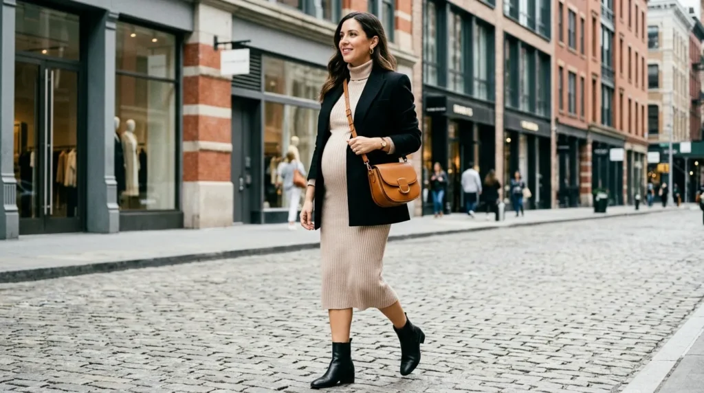 Here’s one of my personal favorites: a ribbed beige turtleneck dress underneath a structured black blazer, finished with a caramel crossbody bag. This is what “still having your style while pregnant” actually looks like in practice.