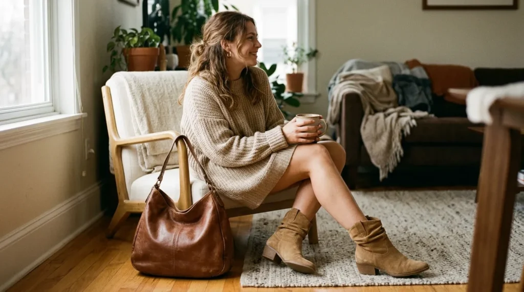 | Cozy home days | Soft knit serenity | Oversized sweater dress + ankle boots |