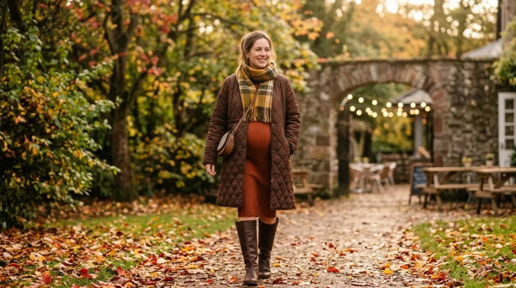 | Country/outdoor walks | Quilted layers | Quilted coat + knit dress + knee-high boots |