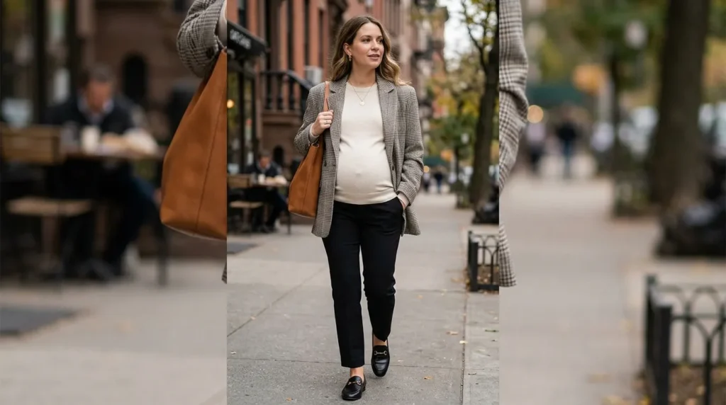 You might be wondering whether a checkered blazer counts as a maternity outfit. It absolutely does — especially when you pair it with a white top and stretchy black trousers. The oversized cut gives you the structure of traditional tailoring without any of the restrictive fit.