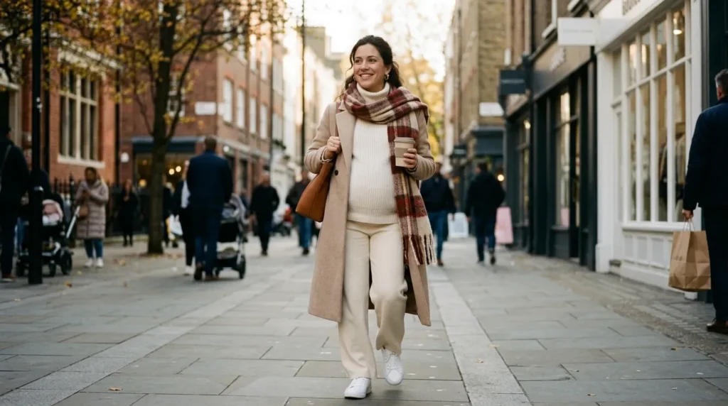 A beige longline coat over ivory trousers and a knit turtleneck, finished with a checkered wool scarf and white sneakers. This is maternity street style 2026 in its purest form.