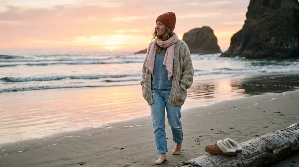 An oversized cardigan, a muted top, relaxed jeans, slippers, and a blush-toned scarf. This look has the quality of a sunset — soft, warm, unhurried.