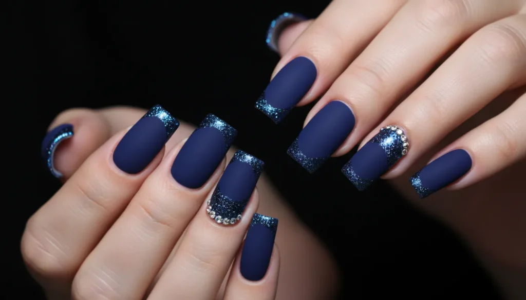Deep navy blue matte base on long square nails creates serious impact. Sparkly dark French tips give the whole look a cool, celestial feeling. Tiny rhinestones right at the cuticle add just enough bling to make it feel special without being over the top. This dark and glamorous design stays feeling totally unique and eye-catching.