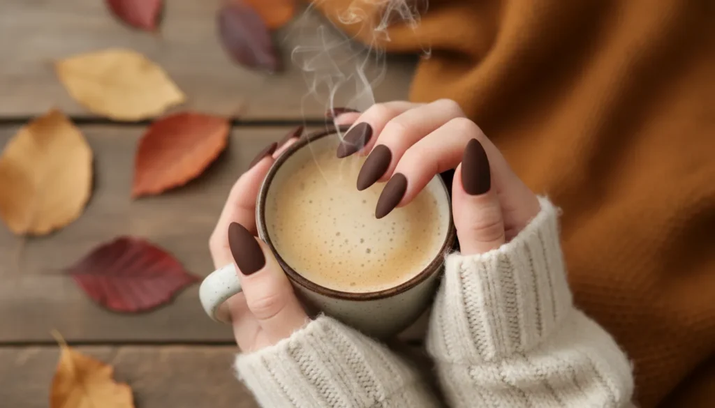 Deep cocoa brown is such a cozy choice for matte finish. The sharp almond shape makes hands look sophisticated and sleek in that understated way. It gives off warm, earthy vibes that are perfect for cooler weather. You’ll love how this understated color still manages to make a major statement through texture alone.