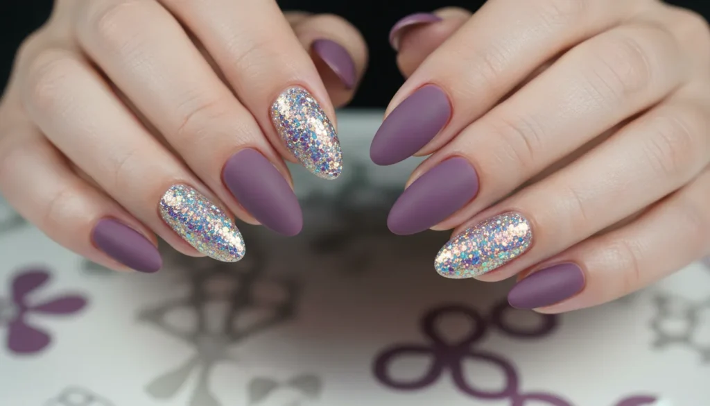 Muted purple matte nails give off such a cool, velvety vibe that feels effortless. Chunky iridescent glitter on the accent nail brings life to that flat finish without overwhelming it. Almond shapes honestly do wonders for making hands look super elegant and elongated. Combining these two styles works perfectly when you want subtle with a sparkly twist.