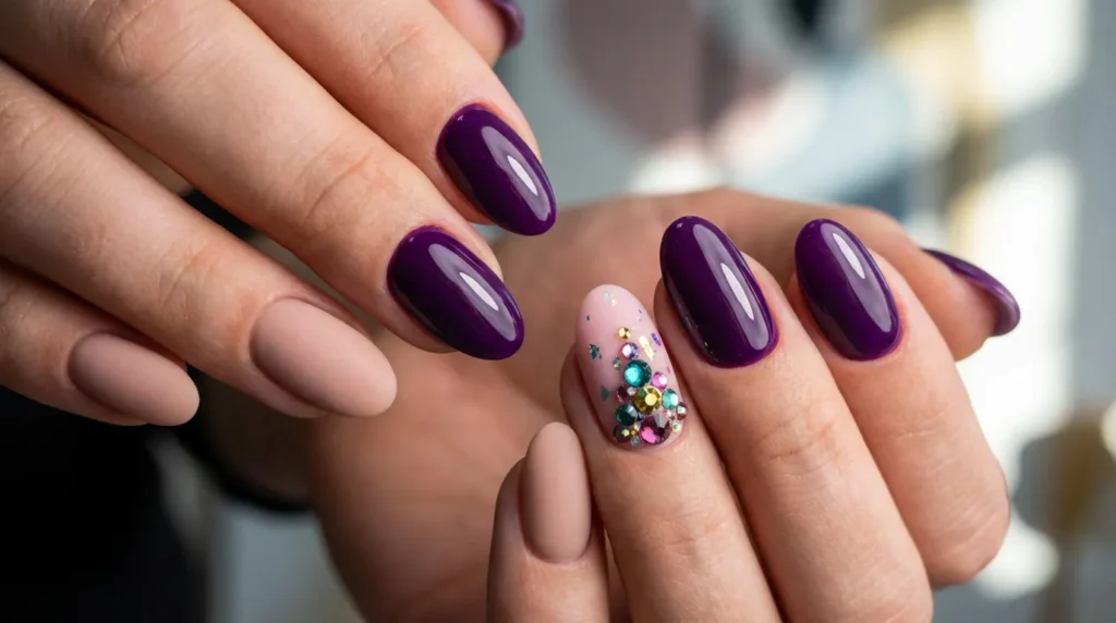 Mixing matte nude with high-gloss deep purple and soft pink creates such a fun, eclectic vibe. Little colorful rhinestones scattered on a matte accent nail add playful sparkle. Combining different textures and shades makes your manicure feel totally custom and unique. Oval shapes help keep all these varied elements looking soft and cohesive for everyday wear.