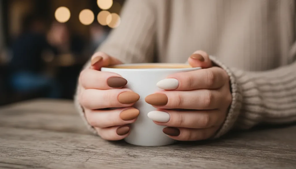 Rich, coffee-inspired shades transitioning from deep cocoa to soft cream create this incredibly sophisticated gradient. The matte finish makes those colors look velvety and luxurious without any typical shine. Using different tones on each nail adds visual interest while keeping everything cohesive. You could rock this with literally anything—cozy sweaters or formal dresses—because these earthy neutrals are universally flattering.