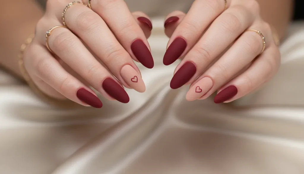 These deep red matte nails are seriously mood-setting. That velvety finish makes the almond shape look expensive and intentional. The tiny heart detail on a nude accent nail adds the cutest touch without overwhelming the overall sophisticated vibe. It’s the perfect way to wear a classic color while keeping everything feeling super modern and fresh.