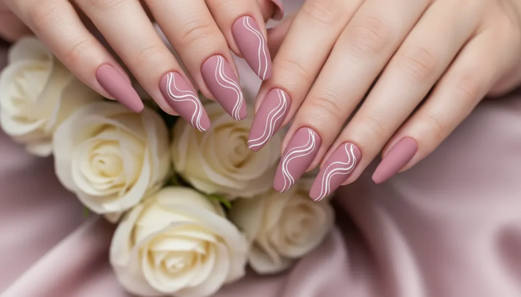 Dusty rose matte creates such a pretty, feminine base. Those thin white wavy lines give long stiletto nails a graceful feel that’s both delicate and striking. It’s a great way to try nail art while keeping things soft and romantic. You’ll feel elegant wearing this design whether you’re at work or out for the evening.
