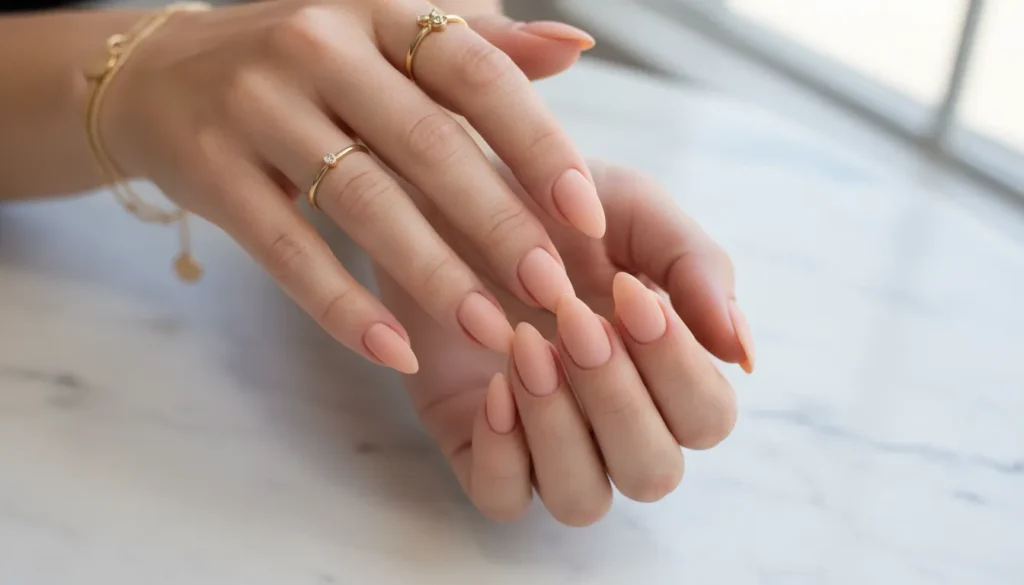 Soft peachy-nude matte is the ultimate clean aesthetic. The almond shape looks incredibly classy paired with that muted, velvet-like finish. You can wear this with chunky gold rings and a blazer to feel instantly more put-together. It’s the perfect choice when you want something that literally goes with everything in your closet. Simple, sophisticated, timeless.