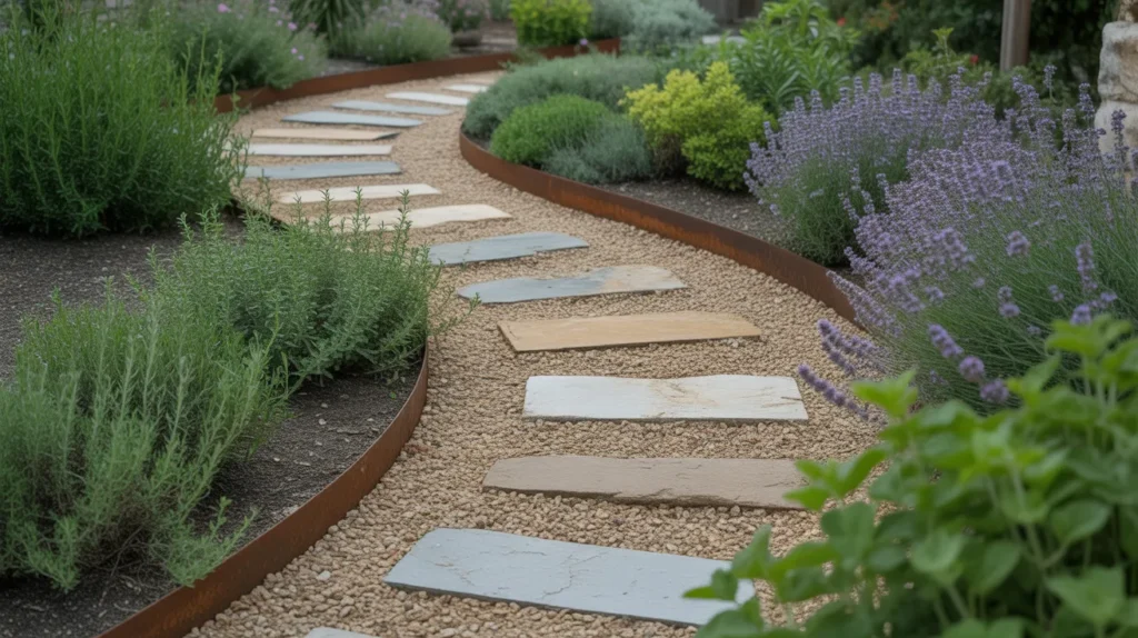 Natural Stone: Irregular flagstone set in sand or gravel creates beautiful, organic pathways. Leave gaps for creeping thyme or Corsican mint. Cost: $15-25 per square foot.